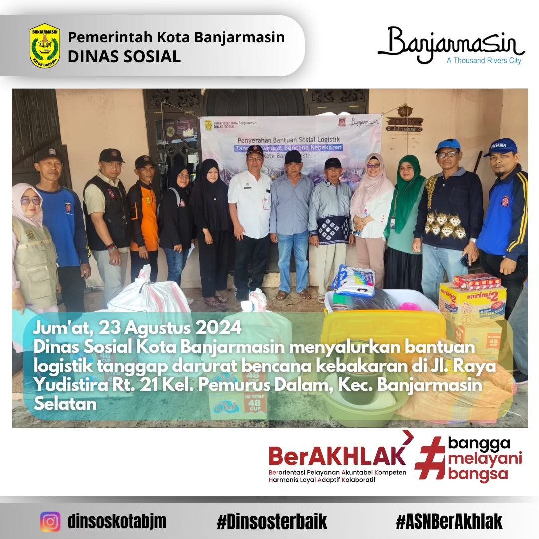 Jum'at, 23 Agustus 2024 Dinas Sosial Kota Banjarmasin menyalurkan bantuan logistik tanggap darurat bencana kebakaran di Jl. Raya Yudistira Rt. 21 Kel. Pemurus Dalam, Kec. Banjarmasin Selatan dengan dampak korban bencana kebakaran sebanyak 3 KK , 6 jiwa. barang bantuan logistik kebakaran di serahkan langsung secara simbolis oleh Kepala Dinas Sosial Kota Banjarmasin Bapak Nuryadi, S.Pd., MA bersama dengan relawan sosial serta elemen masyarakat lainnya.